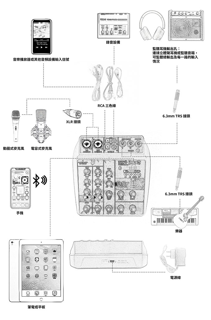 • 適用於教室、街頭藝人、家庭、KTV、擴大機前置輸入連接